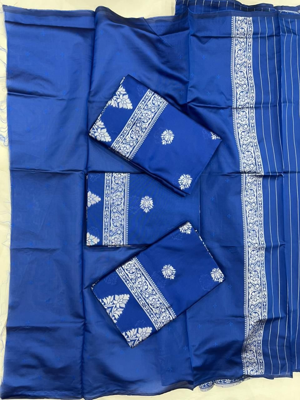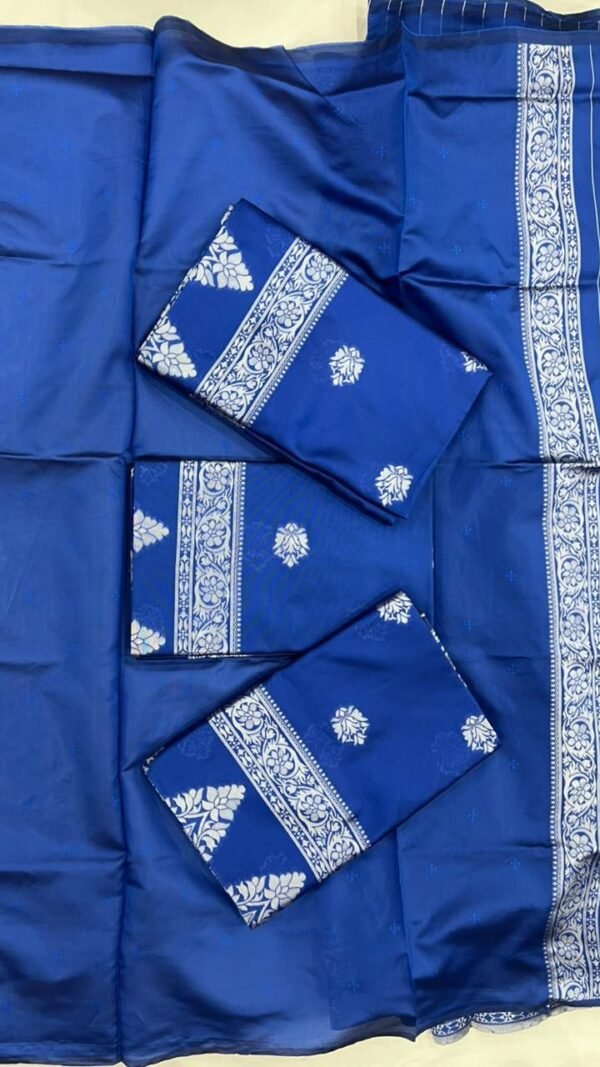 Explore elegant Soft Lichi Silk Sarees for Women with rich pallu design and beautiful jacquard work. This stylish blue saree features an exclusive jacquard border blouse and a premium finish. Perfect for festive wear, party wear, and special occasions.