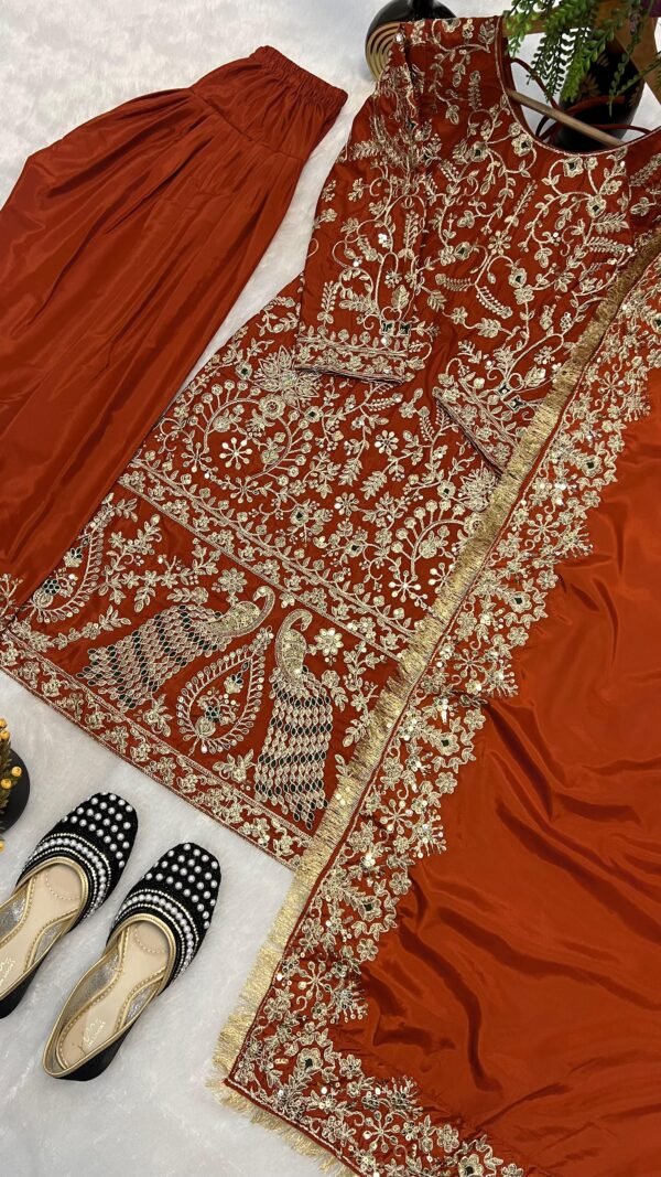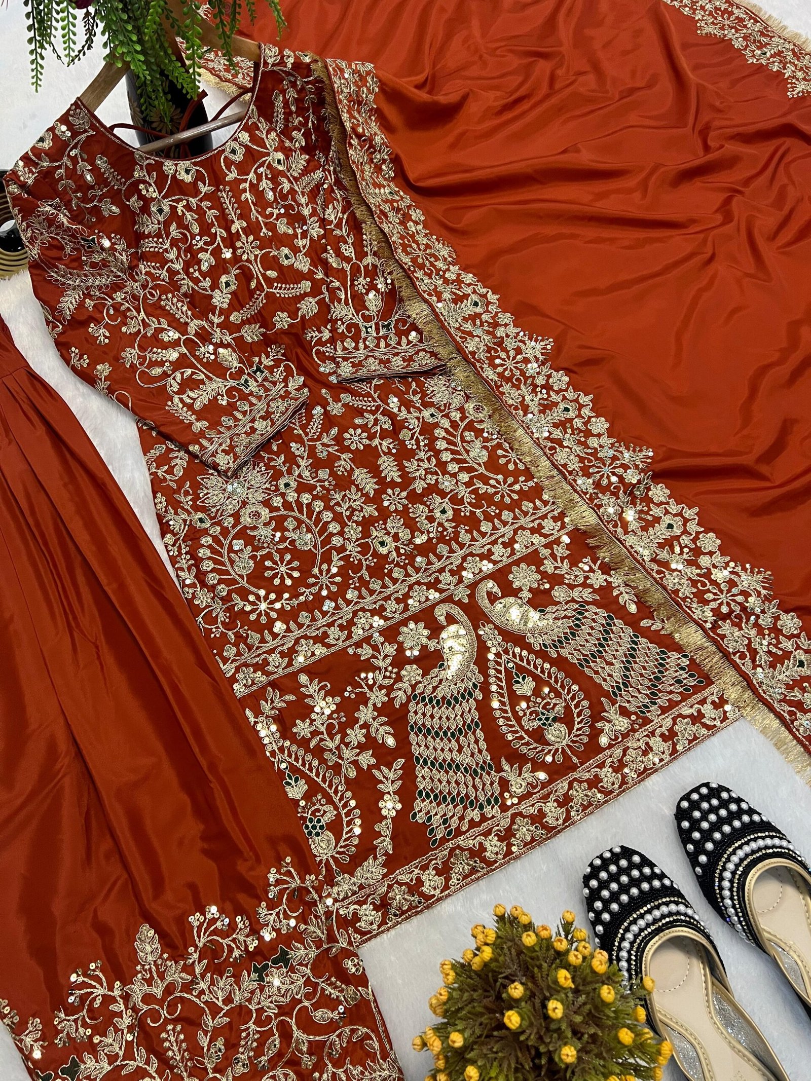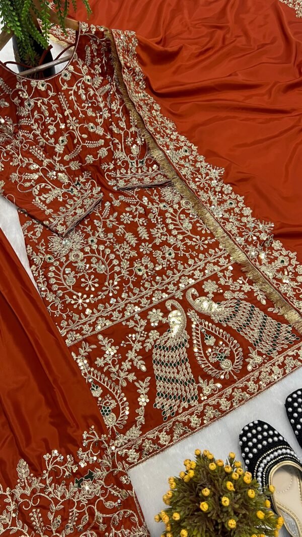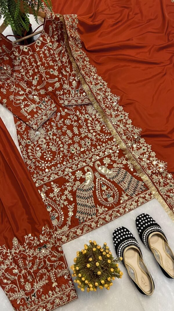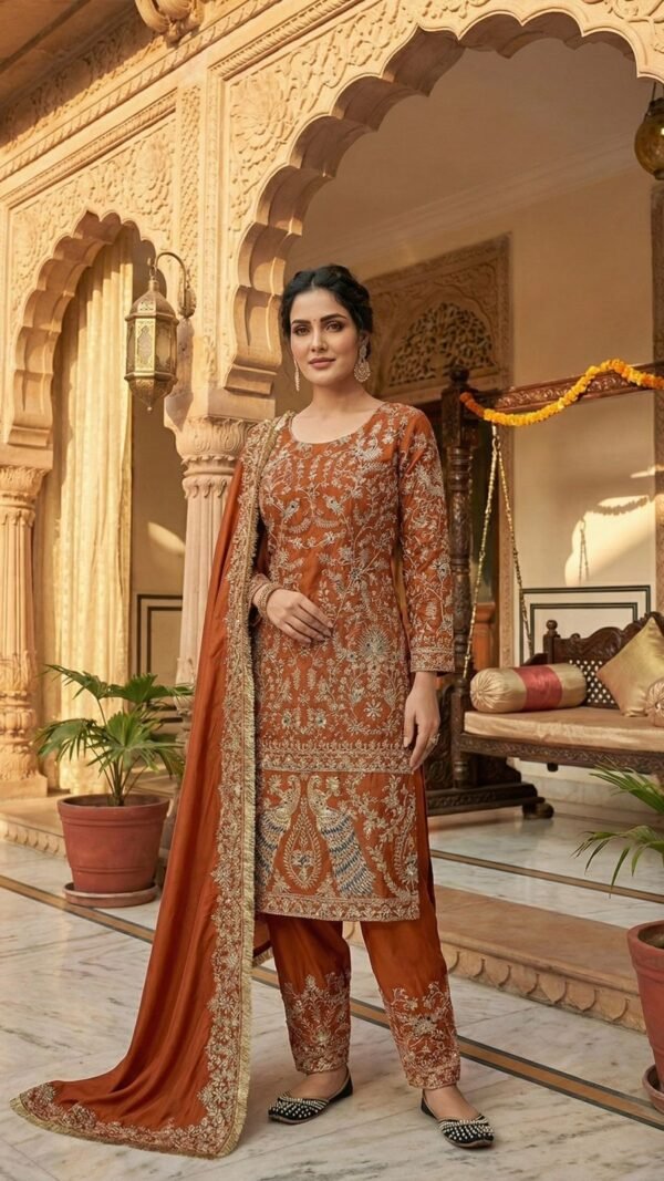 Designed for modern women who love traditional elegance with contemporary styling, this premium outfit is perfect for festive occasions, family gatherings, Eid celebrations, weddings, and graceful party wear. Moreover, its refined embroidery and rich rust tone create a designer look that feels luxurious while remaining affordable.
