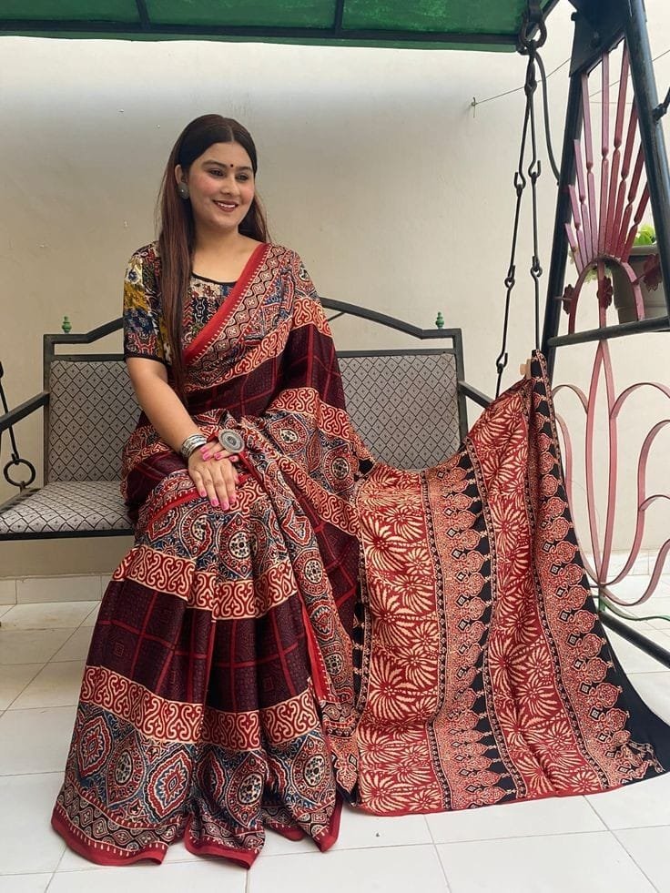 Ajrakh Digital Print Muslin fabric Saree With very soft in texture.. Light weight Silk Fabric with a rich glaze .
